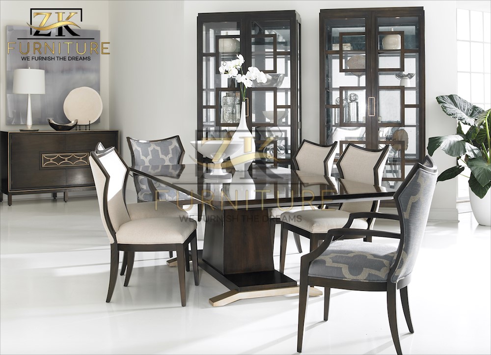 A stylish 6-seater dining set with a dark wooden frame, ladder-back chairs, and soft cushioned seats – designed to add warmth and sophistication to your dining area.